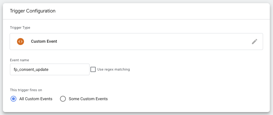 <figure><img src="https://1666823438-files.gitbook.io/~/files/v0/b/gitbook-x-prod.appspot.com/o/spaces%2F-MA7aDqsXMFbUsWVqonF%2Fuploads%2FMIZSJDswOYAVD3XBJPH0%2FScreenshot%202026-02-27%20at%2011.44.01%E2%80%AFAM.png?alt=media&#x26;token=1b8b9eb4-6d07-4f33-b920-967eb7c17f25" alt=""><figcaption><p>Configuration of Custom Event trigger for <code>fp_consent_update</code></p></figcaption></figure>