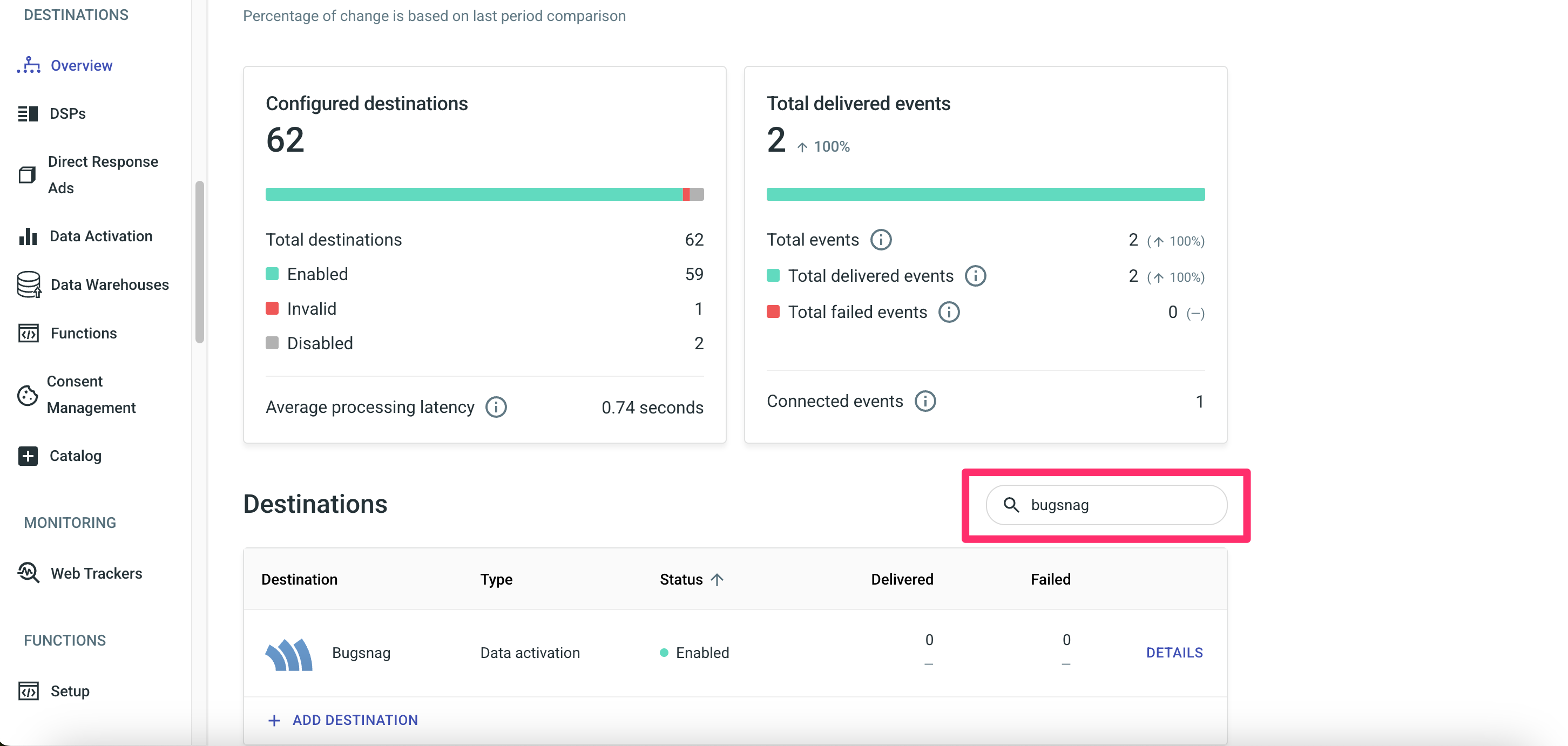 Once the Bugsnag integration is enabled, you can now set it as an event destination